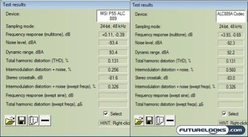 Using RightMark Audio (RMAA) we discovered some audio performance issues within the MSI motherboard which uses the ALC889 Codec versus the Intel’s ALC889A Codec. The first symptom revealed itself in the form of low quality audio playback requiring much lower audio settings to complete the tests.