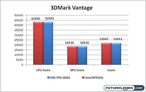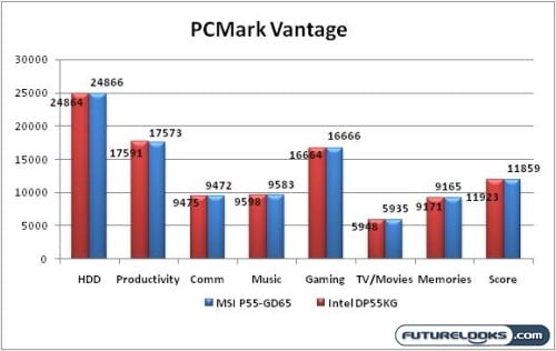 The scores are pretty close overall with a couple varying in favor of the competitor. Intel boards always seem well tuned for productivity when it comes to the Futuremark benchmark software.