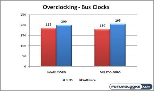 As you can see in the benchmarks, the MSI P55-GD55 compares favourable to our reference INTEL P55 platform. Both overclock well with the MSI P55-GD65 clocking in at about 5 MHz Bus Clock more than the Intel DP55KG reference board. If it were a solid 10 MHz, it would be something worth throwing confetti in to the air, but free performance is free performance.