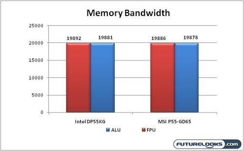 Think of your system’s memory bandwidth as a river carrying your processor. The faster it goes, the more data that can be processed by the CPU. These P55 systems can haul butt in this respect churning out 19 GB/s a second. With the CPU pushing 4 GHz and memory at 2 GHz, memory bandwidth tops 26 GB/s (graph not shown).