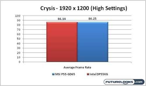 Sure, there’s plenty of frames here thanks to the Zotac GTX295 on both platforms. However, the game is still super intensive which makes the card’s fans spin up right away. Again, we get scores that are nearly identical which isn’t surprising considering that they both use the same chipsets.