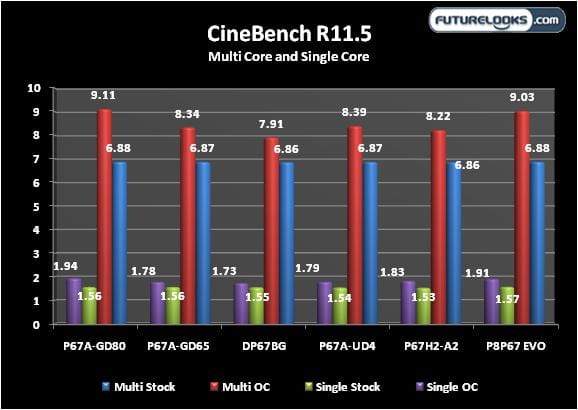 Now, these are some numbers to be proud of for sure. The GD80 is within the pack as most boards with a similar chipset are. Once some overclocking is enabled, the GD80 pulls ahead with its extra performance headroom. It’s clearly a great platform to build a multi-core rendering platform with.