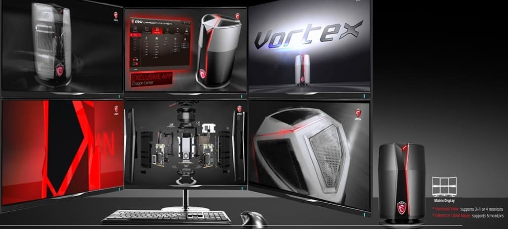 MSI’s Vortex can simultaneously support up to six video outputs for intense multi-tasking and multi-screen experiences, is 4K ready, delivers lag-free gaming with Killer DoubleShot X3 connectivity, and an immersive multimedia experience with Nahimic Military X Gaming, the first audio technology adopted by the French Army to vividly reproduce audio in their aircraft training simulators.