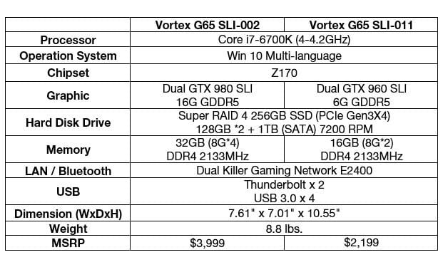 The world smallest gaming cylinder, the Vortex measures only 10.5 inches tall but can blast away bigger systems with an unlocked Intel Core i7 6700K processor, up to 64GB of DDR4 memory, SSDs in Super RAID 4, and dual NVIDIA® GeForce® GTX 980 GPUs in SLI. MSI’s newest tower is also engineered for superior upgradability, expandability, and compatibility with a variety of connectors, including Thunderbolt 3 that supports up to 40GBs of data transfer rate.