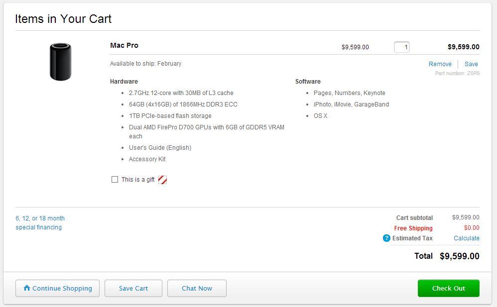 After perusing the shopping cart, we came up with a configuration that tops out at $9,599 which includes 64GBs of ECC DDR3 memory, a 1TB PCIe SSD, two AMD D700 (W9000) GPUs, and a twelve core Intel Xeon 2.7GHz processor. OS X is of course the default operating system.