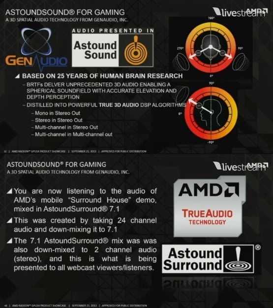 Next is the new AMD TrueAudio Technology with fully programmable audio pipelines. This technology puts the audio processing of your games into the hands of the developers and eliminates the need to rely on a 3rd party hardware/codec. I am not sure how big of an impact this will have as other limitations come into play with audio such as speaker systems, headphones, motherboard support, etc. At the very least it will minimizes CPU overhead and perhaps other resources at most.