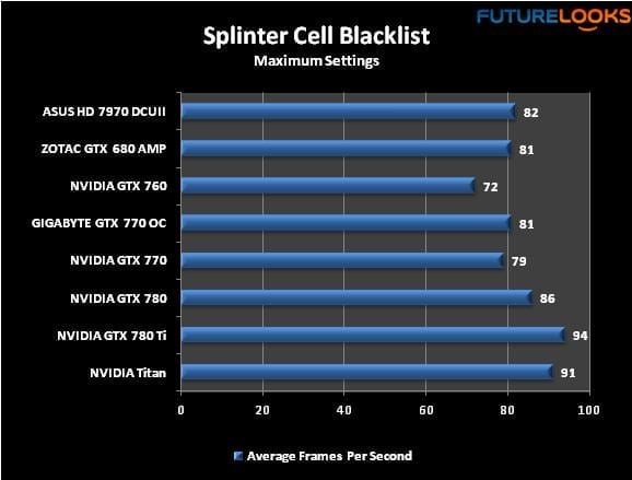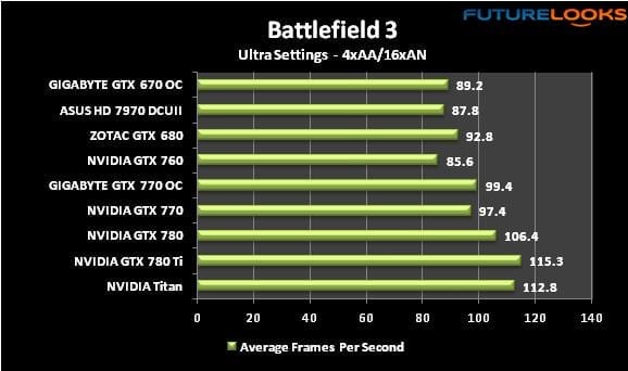 I opted to use Battlefield 3 in benchmarking instead of Battlefield 4 which may need a patch before I’m convinced it’s ready for the lab. At any rate, the GTX 780 Ti ran quite well on a fresh OS install. The Titan again remains right on its heels. Ultra settings really give the game character.