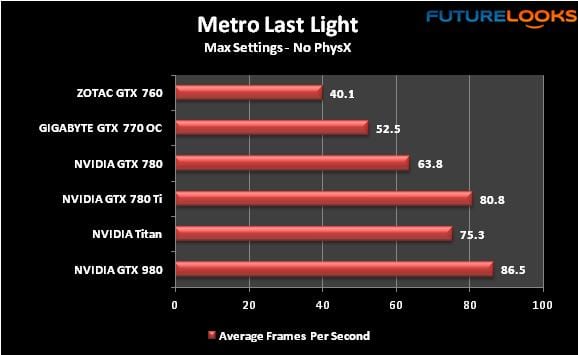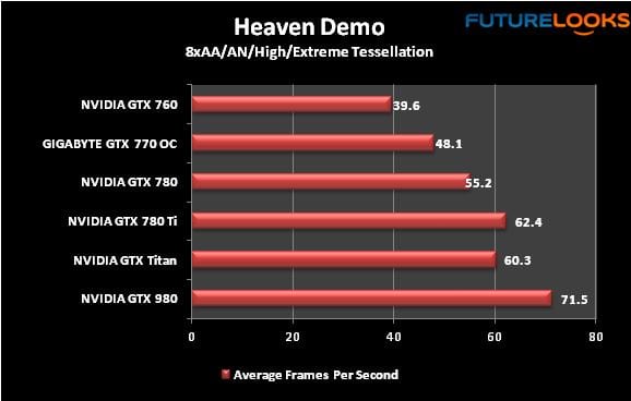 After running the benchmark many times, the GTX 980 managed 108 FPS in the demo. That’s very impressive against the GTX 780’s lower 88 FPS. The GTX 780 Ti closes the gap a bit more at 97 FPS.