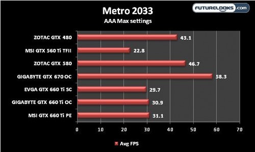 And, the beatings just get worse with Metro 2033. Still, the three cards split the difference coming up with about 30 frames per second each in this still punishing benchmark. It’s worth noting thought that the GTX 480, which can still be found on the market for the same price, is more than 10 FPS ahead of the new GTX 660 Ti. Keep in mind, if Metro 2033 supported TXAA and FXAA, the cards would potentially offer a flip in the results. Either way, actual in game frame rates between our batch of GTX 660 Ti is very close and bests the card it replaces, the GTX 560 Ti.