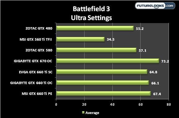 Yes, Ultra settings in Battlefield 3 will slap any GPU silly especially at 1080p resolutions. Overall, everything was smooth sailing throughout with any of the GTX 660 Ti as I get my war zone fix on. For a minute there, each card made me wonder if the GTX 670 OC was accidentally installed due to the close proximity of the frame rates to one another. The trio GTX 660 Ti again offer very playable frame rates. One thing you might have noticed is that despite the higher overclock of the GIGABYTE, the MSI still manages to best it in the last few benchmarks. It appears that the more stable voltage of the MSI is starting to play its hand.
