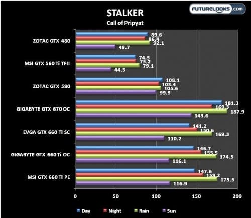 Well, the trend continues. The GPU muscle and memory frequencies add up to strong frame rates overall. While not shown, overclocking these cards was practically pointless as it would only add about 3 frames extra. Frankly speaking, it’s just not worth pushing these lean and mean cards any further. Due to the age of this benchmark, you can see the older cards start to file in, but based on the majority of benchmarks, you can see that the newer the game, the better the new GTX 660 Ti performs.
