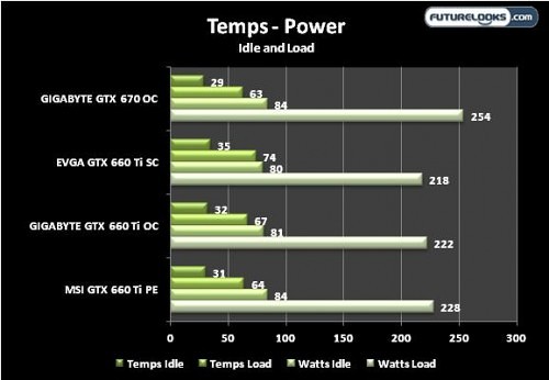 Finally, the GTX 660 Ti cards are not power hungry at all. The MSI GTX 660 Ti PE required the most power but it also features a more aggressive VRM than the rest. Granted, the ASUS Maximus V Gene is a somewhat lean gamer platform, but to be able to run one card and not top 250 Watts is awesome. It’s obvious that power gamers can run two GTX 660 Ti on a good quality 80PLUS Bronze or higher 650 Watt power supply without issue.