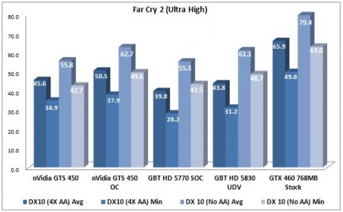 Where we have Crysis, we have Far Cry2 not that far behind. It’s nice to see every card producing playable frame rates in this game. nVidia’s cards are strongest across the board and the overclocking of the GTS 450 even has it catching up with the much more expensive HD 5830 and trouncing the already overclocked HD 5770.