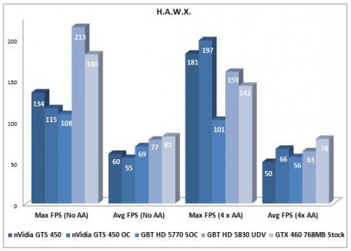 H.A.W.X. doubles up as our flight simulator benchmark. It’s a really beautiful game that gives us access to eye candy from real aircraft models and real satellite maps. It’s nice to see all the GPUs tested being able to play this game with AA on or off. But of course, we’d keep in on now that we know we can. In fact, with AA on, HD 5770 falls to the might of an overclocked GTS 450.