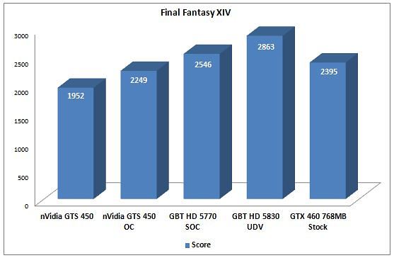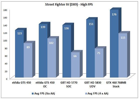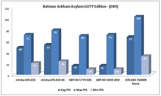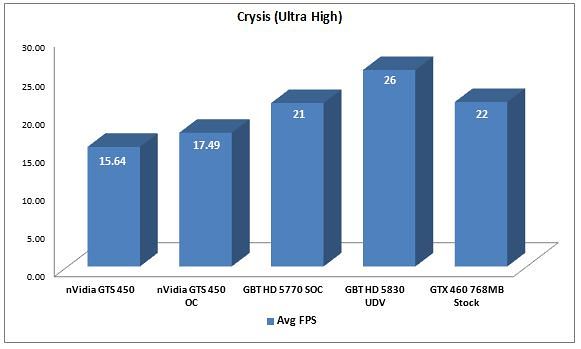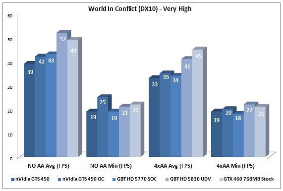 Like Crysis, this game represents one of the most punishing tests a GPU can go through. We refrained from hitting the EXTREME setting and just settled for Ultra High while running the gamut of tests and we got playable averages for all the GPUs. The GTS 450 overclocked beats an already factory overclocked HD 5770 in this particular game.