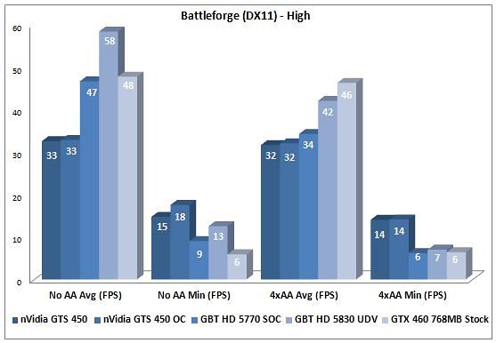 Battleforge is another great RTS benchmark that’s free to play and is put out by EA. It uses DX11 and looks really great and is fun to play when you get sick of Zergs, Protoss and Humans. The benchmark gives us an absolute worst case scenario with some crazy amounts of characters on the map. As you can see, it definitely stutters a bit with some very low minimum frame rates, but all cards produce playable averages with AA off or on. HD 5770 takes it in this round against the GTS 450.