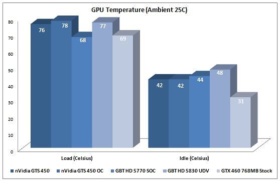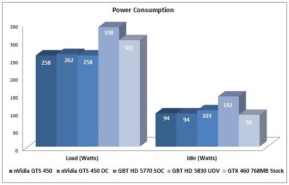 Overall, the power consumption is comparable to the HD 5770 with the exception being idle consumption. The GTS 450 seems to consume fewer watts when it’s not doing anything.