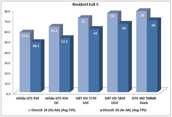 Resident Evil 5 provides some extra test material for our look at how anti aliasing can affect performance. We are happy to report that 4x AA is something you should turn on in this title as the impact does not kill frame rates enough for you to not enjoy the extra picture quality. This game is completely playable and smooth with any of the candidates tested here but the GTS 450 does get beaten by the HD 5770.