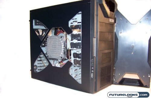 Opening the left panel, back side of the motherboard tray, reveals that it’s pretty barren in terms of useful space. It was a little disappointing to see so very little space that could be used for running wires to help with a little cable management. Offering this feature would require sacrificing about half an inch inside the system area as well as a little extra fabrication in terms of cut outs.