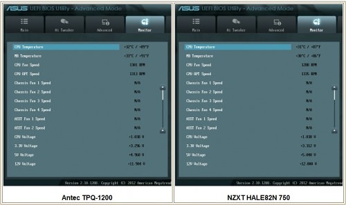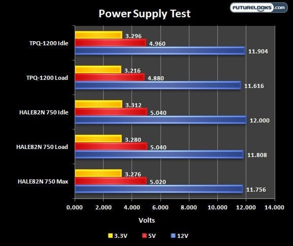 Here, we see a system characteristic when using high watt and a lower watt PSU. The TPQ-1200 doesn’t have much of a draw on it plus the +5V and +12V rails are a bit lower. The HALEN82 750 is very comfortable with the test system providing exactly what is needed across the rails as well. Let’s see what happens under load.