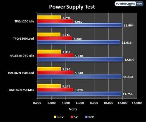 A similar picture is painted with the system at idle, under system load, and max load. This indicates the HALE82N 750 will give you its rated wattage within respectable tolerances. With minimal voltage fluctuations, good tolerances, and 82% efficiency, this is all anyone can expect from any power supply. If you push the PSU out of specs, expect to see lower voltages and higher electrical load noise. Fortunately, the unit’s safety measures will shut it down before any major damage can happen to your system.
