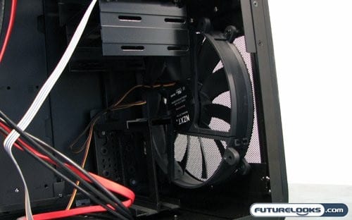 Now I had said that some may have issues with the “low” number of 5 1/4″ bays on this case. Really, if you’re building a LAN box, you want lots of hard drives. A nice mix of the fast, for loading games quickly, and the cavernous, for…other activities, is usually preferred. NZXT has placed four 3 1/2″ drives inside the Panzerbox, and positioned them in way that ensures they get the most cooling while still staying out of the way. This does lead to a rather odd orientation.