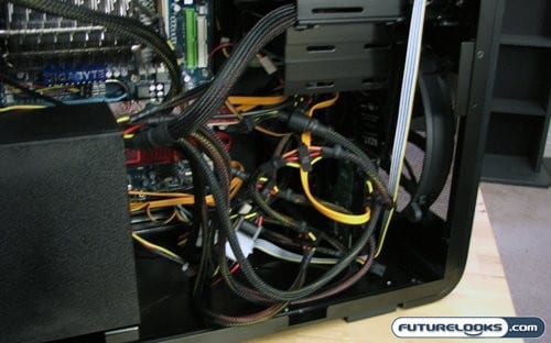 The one big thing to be aware of with the Panzerbox is cable management. Due to the shape of the case and the position of the power supply, you’ll want to have plenty of zip ties and other types of cable tie down handy. Now my efforts were rather rushed, resulting in what you see pictured. However with every power supply having it’s cables exiting from the same approximate location, you are still left with a big bundle of power cables shooting out right in the middle of your case.