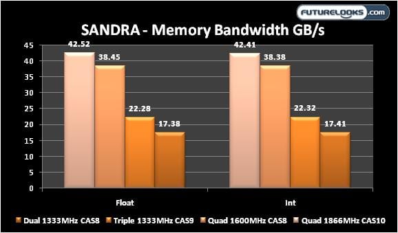 As observed, the data transfer rates increase each time a stick, or channel, of memory is added from system to system. Quad channel really screams producing just over 38GB/s (per second) data transfer rates. Notice that overlocking the kit doesn’t improve bandwidth that much due to the CAS 10 latency timing.