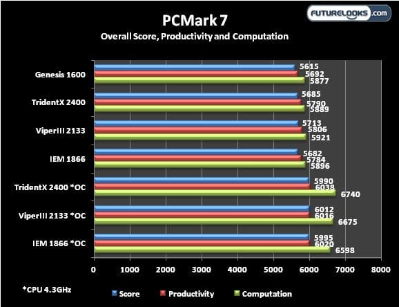 The different speed memory modules do have some affect on scores here. The computation score is the tell-tale sign that the memory is used a bit more in that particular test. While the overall performance isn’t much different with stock settings, the overclocked CPU does reveal the benefits as more bandwidth is readily available from each kit.