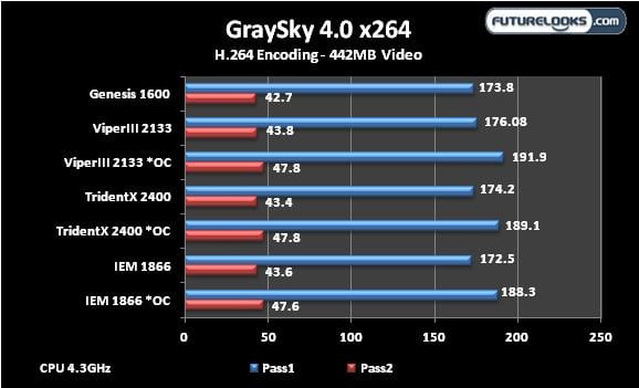 The default frequency of the IEM kit reveals it to be about 4 frames slower than the faster ViperIII 2133 MHz kit. And, it only falls just 2 frames short of the elite 2400 MHz TridentX. Overclocking the CPU reveals the performance quality of the Hynix underneath scoring within one frame of the TridentX. In this respect, the ViperIII/IEM are using the most efficient modules we’ve seen.