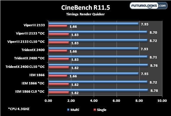 As you can see, It looked pretty uneventful here until I realized that the slower IEM memory scaled similarly to the faster kits. One benefit worth noting is that the IEM kit ran a lower CAS Latency 9 timing without extra voltage which helped rendering performance. You’ll find this to be the case with many overclocking kits.