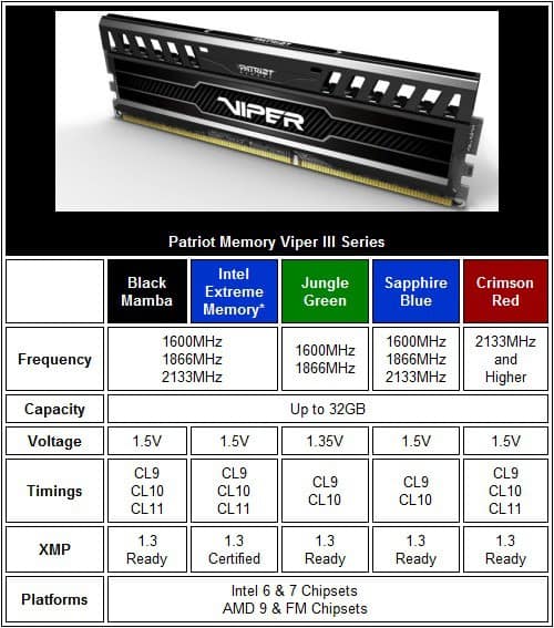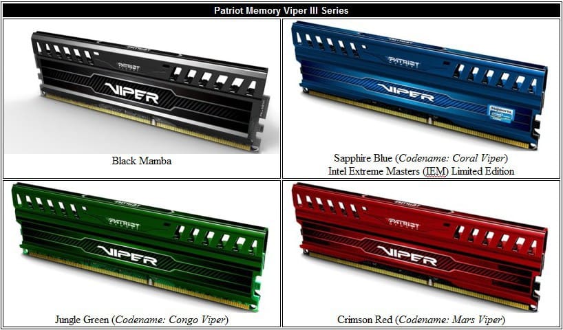 Recently, Patriot announced their new Viper III memory line at Computex 2012 in support of Ivy Bridge processors and Z77 motherboards. The latest series is XMP capable and will come with new color choices including red, green, blue and black. Normally, the color changes are just color changes, but Patriot has made additional tweaks to specifications for each color, giving them more than just pretty heatsinks. Since Intel Ivy Bridge has proven hot in operation, you’ll need some good quality memory just to keep up. Let’s see what the new Viper III 2133MHz DDR3 dual channel memory kit can do!