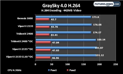 After repeated trials, these were the average encoded frames per second using the GraySky 4.0 benchmark. The reason for the scores being so similar between 2133 and 2400MHz is that the Ivy Bridge CPU isn’t capable of utilizing all that memory bandwidth. Even with an overclocked CPU, it’s the same story.