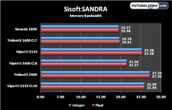 The Viper III 2133 produces about 2MB/s less bandwidth than the TridentX 2400. While one could drop the Viper III timings to CL10, it only offers a little extra memory bandwidth. The unexpected surprise is that the Viper III provides about 2MB/s more bandwidth at 1600 CL8 than the TridentX using CL7 timings. After repeated testing, it’s evident that the Ivy Bridge IMC really favors the Hynix based Viper III.