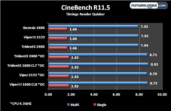 At this point, the test system is running so optimally that there’s only slight changes in performance. Interestingly, the results are very close again as there is more than enough memory bandwidth feeding the CPU. When overclocked, the TridentX 2400MHz shows the advantage of extra bandwidth.