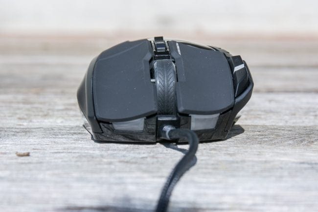 Here is a better angle from the top front. The LEDs located a bit behind the scroll wheel are a visual indicator for the profile and DPI setting you have selected. The two buttons on the image right are the typical mouse “forward and backward” buttons that can be reprogrammed if needed.
