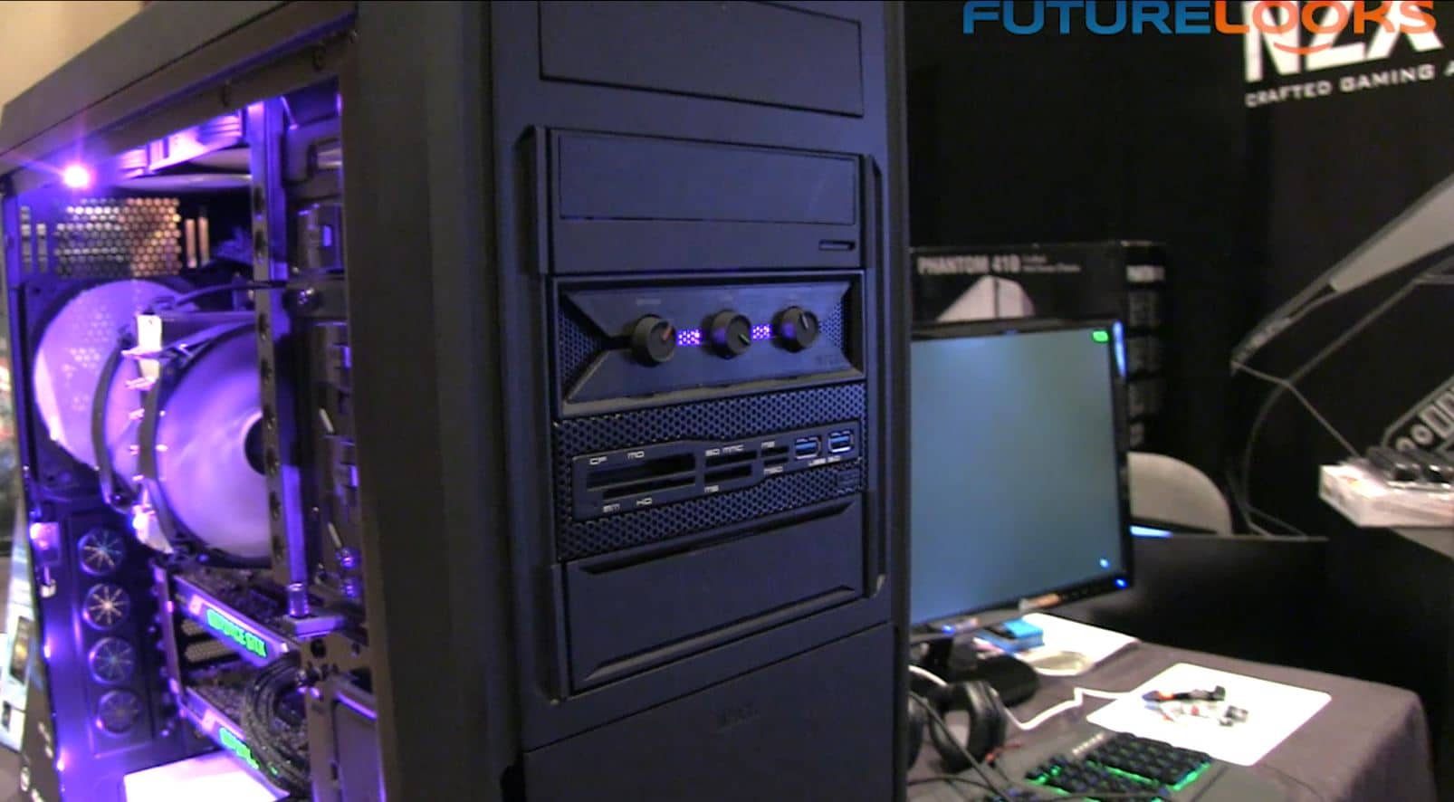NZXT was showing off two new products including their HUE lighting system that provides infinite color adjustments that is unique. Normally LED strips are red, green or blue, but this system does any color you want. Also being shown off was their Aperture memory card reader which allows any case to have the power of a USB 3.0 reader and an additional pair of USB 3.0 ports.