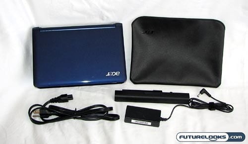 In addition to the Acer Aspire One AOA 110-1722 netbook itself, you get the 2200 mAh Lithium-ion rechargeable battery (3-cell), the AC adapter and power cord, and a leather-like soft case. The soft case offers some protection, but it is very unfortunate that it is completely open-ended on one edge. There is no Velcro or zipper mechanism to prevent an unfortunate spill.