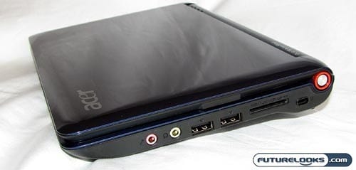 Along the left side of the Aspire One, you’ll find the power port, the VGA port, Ethernet port, one USB port, and a storage expansion slot. Along the right side, there is a Kensington lock, multi-card reader, two USB ports, and the jacks for the headphone and microphone.