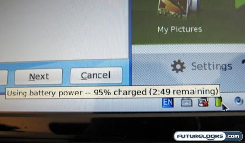 That said, I found that with moderate Internet surfing duties (no other applications running, no more than 3 tabs at a time) and with Wi-Fi on continuously, I was able to get about two to three hours on the 3-cell 2200mAh rechargeable battery. My average, over the course of a couple of days, was in the 2:15 to 2:30 range. Not surprisingly, this dipped when I was playing games, watching YouTube videos, and doing other things that draw more battery.