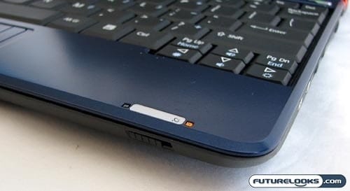 Instead of using a function button to turn the Wi-Fi radio on and off, there is actually a dedicated switch to the bottom right of the netbook. This hard switch can certainly come in handy when you want to save some battery life. The power button is located to the top-right of the keyboard and you’ll notice the indicator lights to the top-left. The narrow gap between the screen and the lower half of the netbook is also a notable design cue.