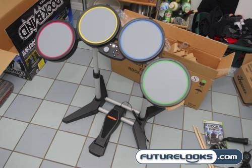 Unlike DrumMania (Bemani), the drum set for Rock Band is only comprised of four pads — a snare, two tom-toms, and a crash cymbal — as well as a kick pedal for the bass. With DrumMania, you get five pads. A small difference, to be sure, but one that must be noted.