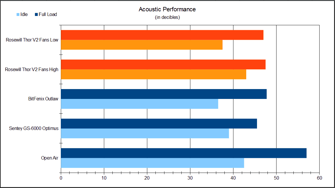 As with all the acoustic testing, I used a sound pressure meter approximately 1 meter away from the case. As this case has a fan controller, I did all tests twice. Once with the fans at minimum and once at maximum. The results of Thor V2 are highlighted in orange to distinguish them.
