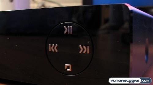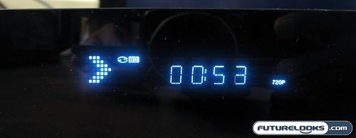 But I’m not saying that this is a bad thing! The Samsung BD-P1500 is a great-looking unit. The front face sports Samsung’s signature glossy black finish, but the rest of the player is a standard matte black. In the front, you get a round set of controls on the right side, but you’ll probably never use these. That said, I’m glad that they didn’t go with touch-sensitive controls for this: I hate those. The power button glows red when the player is off and it glows blue when it is on. The small and simple display also features blue font on a black background.