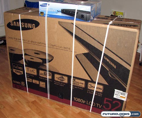 I have to hand it to Samsung. They know a thing or two about carefully packing a large television into an even larger box. In order to provide both great protection and relative ease of mobility, the box for the Samsung LN52A630 HDTV has a couple of little black brackets near the bottom. These hold the box in place. Remove them and the entire box, with the exception of the base, slips off like a sleeve. That’s pretty creative, because it means that you can easily use the handles on the sides of the box for easy transport.