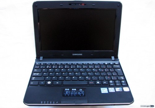 This Samsung netbook otherwise looks like a pretty standard netbook in stature, but it is interesting that the multi-card reader (SD/SDHC/MMC) is located in the front rather than on the sides. Similarly, there is the power slider switch in the front, rather than somewhere above the keyboard.