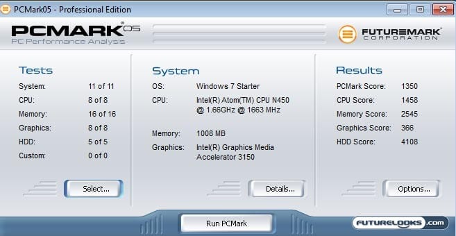 We also run the netbook through PCMark05 and 3DMark06 from Futuremark. PCMark05 gives you a good overall productivity overview while 3DMark06 gives you the goods on basic gaming functionality. I was able to complete all the tests in PCMark05, resulting in the overall PCMark score of 1350 shown above.