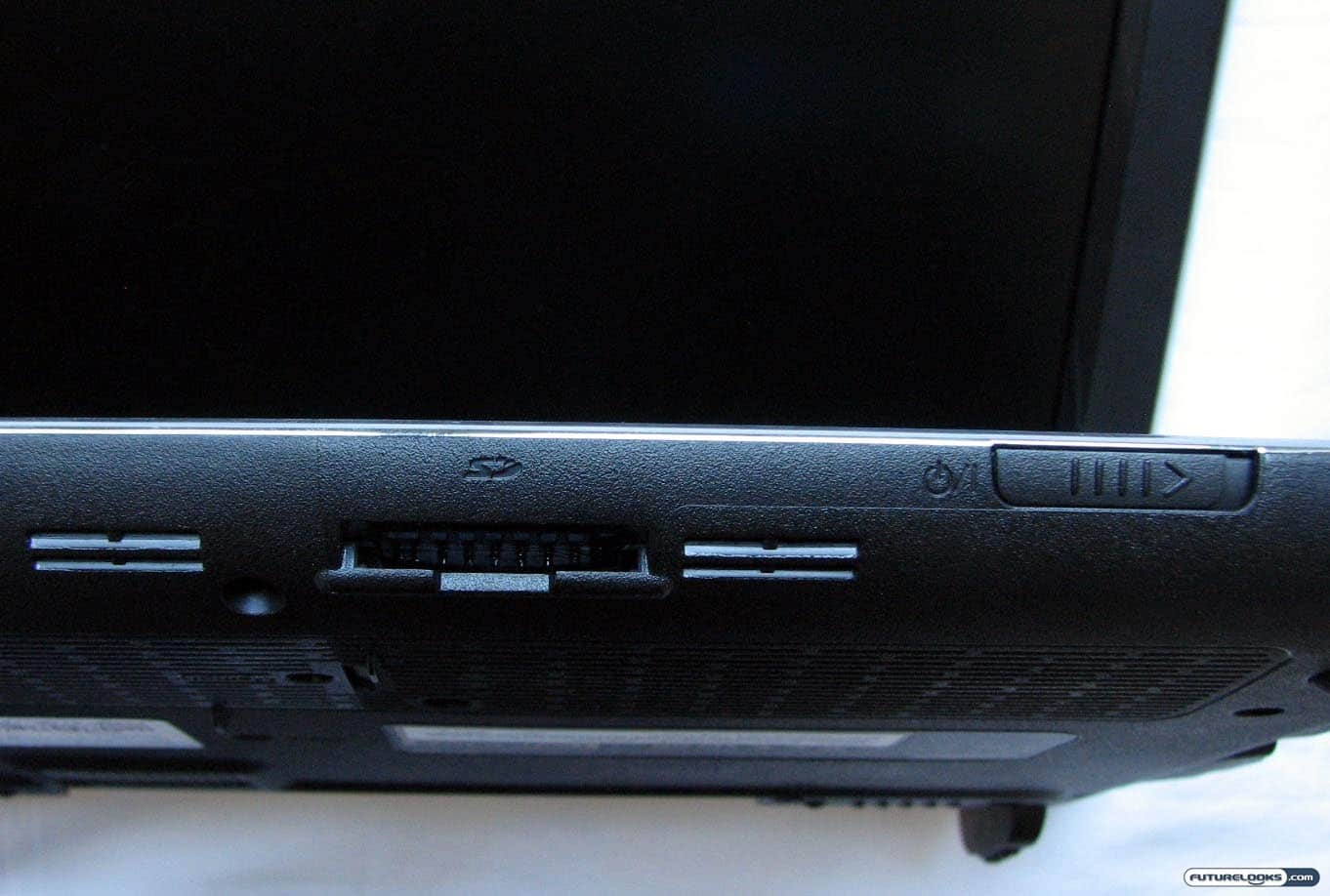 This Samsung netbook otherwise looks like a pretty standard netbook in stature, but it is interesting that the multi-card reader (SD/SDHC/MMC) is located in the front rather than on the sides. Similarly, there is the power slider switch in the front, rather than somewhere above the keyboard.