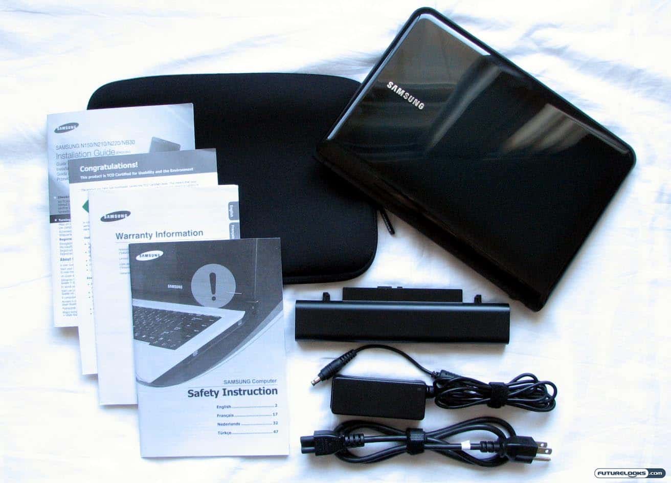 Cracking open the stylish brown paper box, you find the usual assortment of accessories that accompany most netbooks. In addition to the Samsung N220 itself, there is the six-cell battery, power supply with wall cable, and the supporting documentation. There is also a neoprene protective sleeve included in the box. It’s plain black and a little on the thin side, but the zipper portion does have a raised ridge on the inside to protect your N220 from scratches. The non-zipper side, however, feels quite cheap by comparison.