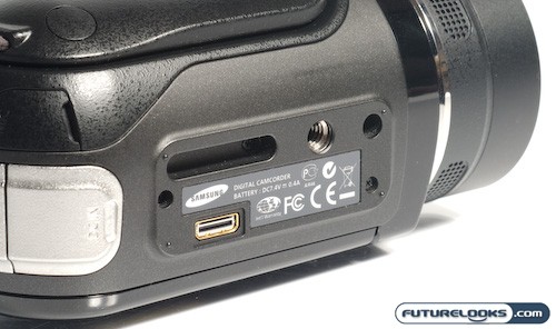 Samsung added the nice touch of a sliding door to cover up the AV output and USB port on the side of the camera. They even gold plated them. However, one thing that they took away was the inclusion of the HDMI port. On the SC-HMX10A, you would find an HDMI port there, which would be handy to have on an 1080p HD camcorder. I mean, last time I checked, composite cables didn’t output an HD signal and HDMI makes more sense than component for 1080p output.